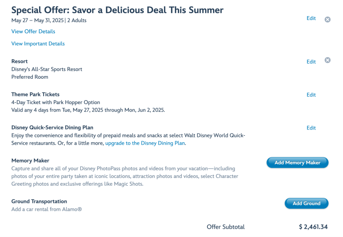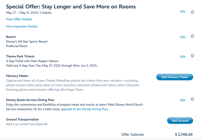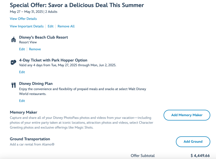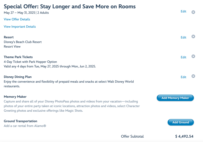 We will use those same set of dates and number of park tickets as well. There is a Stay Longer Save More offer currently for that time frame as well that is offering about 25% off of your room. This total is $4,492.54. This is $42.88 more, so it’s very close to the same amount to do either.
