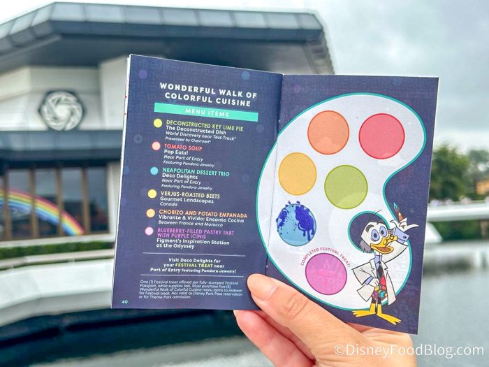 The Wonderful Walk of Colorful Cuisine has a couple of built-in benefits: First, it encourages you to try a variety of menu items at the different Food Studios (also known as Food Booths) around the park — some of which just may become new favorites for you! Second, there is a PRIZE involved… just for snacking around the world. Let’s dig in!