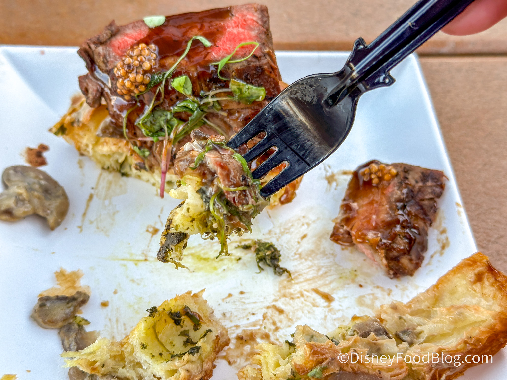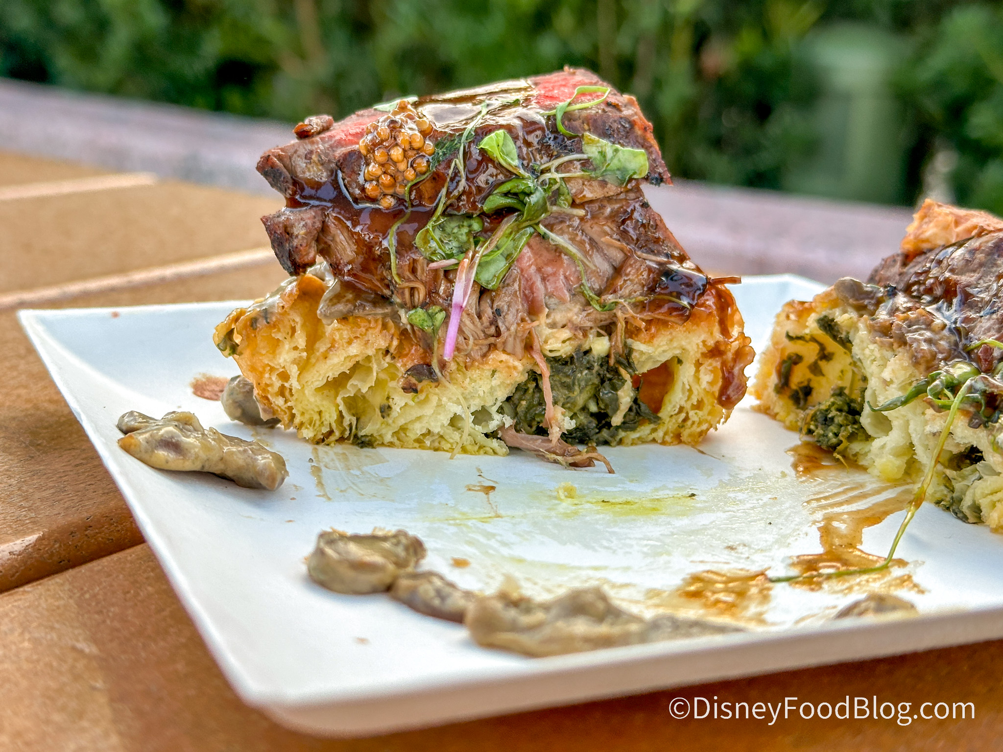 This menu item is new to the festival this year and is made with creamed spinach croissant pinwheel, mushroom-gorgonzola ragout, mustard-grilled flank steak, red wine sauce, and pickled mustard seeds. We had a similar dish last year at Cuisine Classique (a booth that didn’t return this year). In our previous experience with this item, it fell a little flat except for the super flavorful red wine sauce. Will this new iteration of a familiar item be an improvement from last year’s experience?