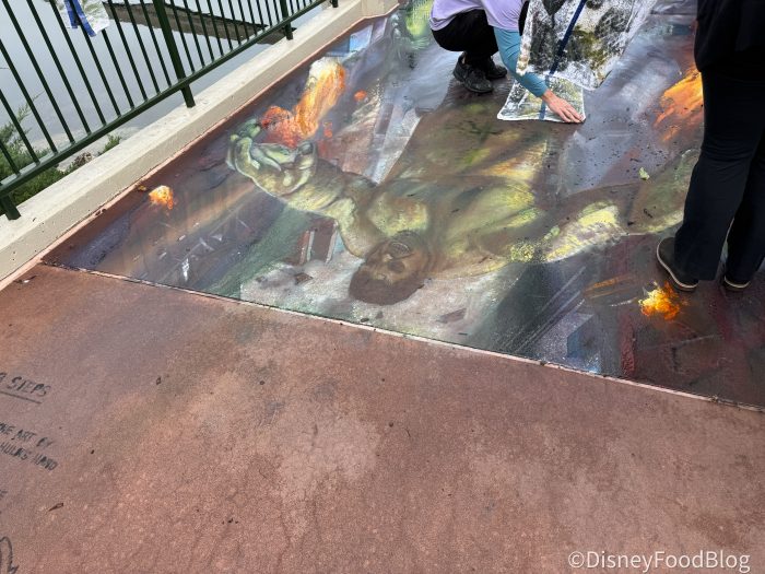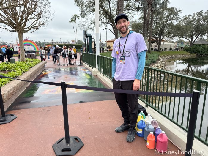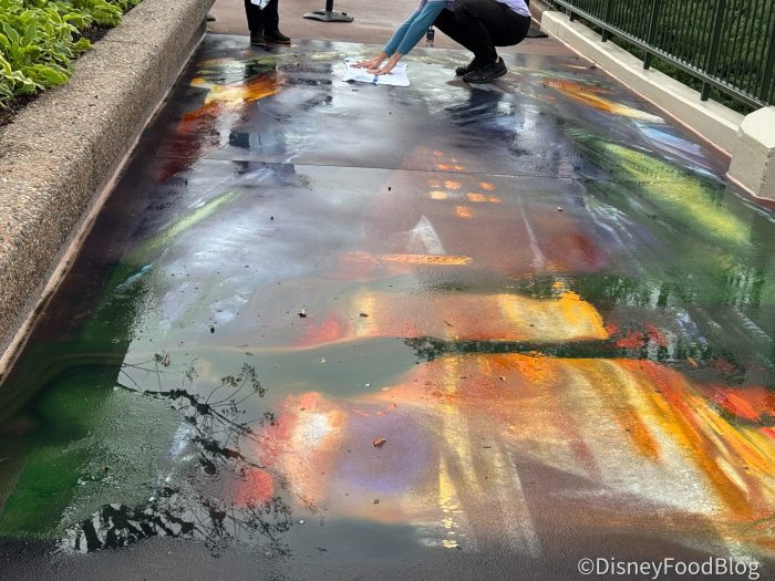 EPCOT’s Festival of the Arts is one of our favorite times to visit EPCOT around the year, and while we were busy eating and drinking our way around the park to find out the best options for you to try out this year, there are other parts of the festival we rave about year after year like the entertainment. The festival’s entertainment options are a don’t miss between the animation classes, listening to Broadway performers singing Disney songs at night, and taking in all of the chalk art and watching the artists in progress as they bring these creations to life. But, an unexpected circumstance brought us face to face with a chalk artist who had to come back and make some adjustments to his newly minted creation (and he was gracious enough to answer our burning questions!)