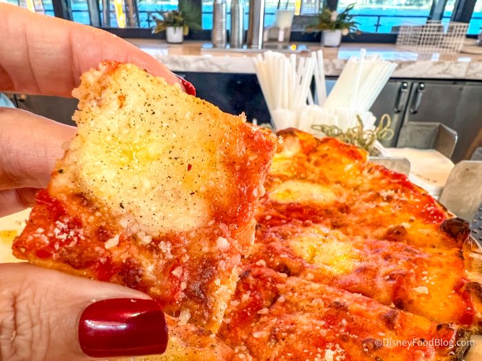 The other dining option we decided to try was the Lobby Cut Tavern Style Pizza for $12! Now, you can choose to add on sausage, pepperoni, or spicy giardiniera for an additional $3 each. This is the same pizza you’ll find on their lunch menu, which is AMAZING because on the lunch menu, it’s $19.95.