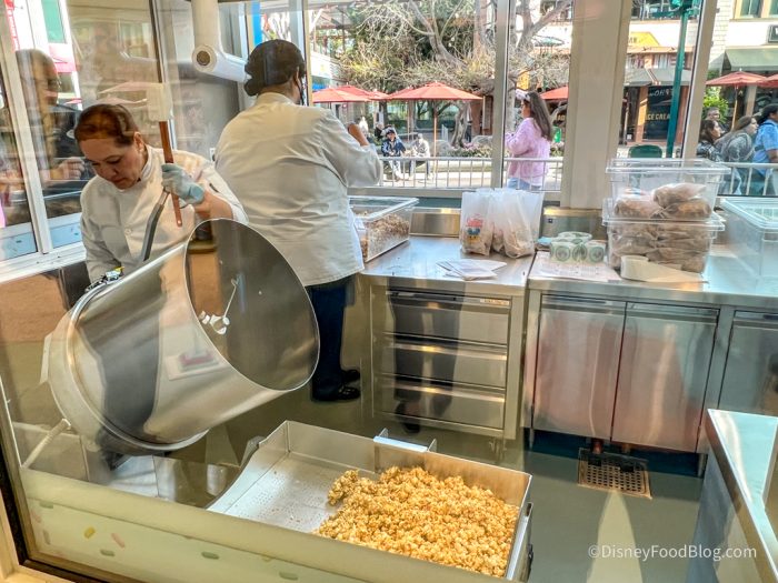 Since this is the Disney FOOD Blog, let’s start with the food. Can you tell what we’re most excited about? The POPCORN! But this isn’t just any old popcorn. It’s the Werther’s Original Caramel Popcorn, which you might recognize if you’ve ever visited Karamell-Küche in EPCOT. (And yes, we checked. It’s the same recipe as the stuff in Florida. PHEW!) This stuff is warm, fresh, buttery, salty, and LOADED with that signature Werther’s caramel. We dream about this popcorn. It’s heavenly.