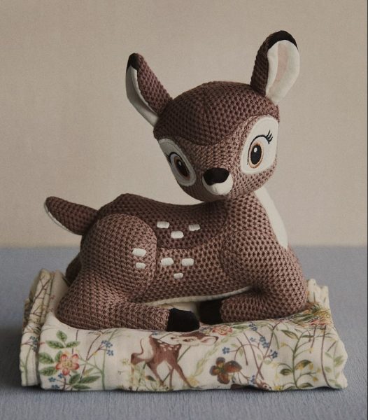 This padded rattle is made with a crochet-look cotton knit with embroidered details and appliqués. Plus it looks just like Bambi, so little ones will love it.