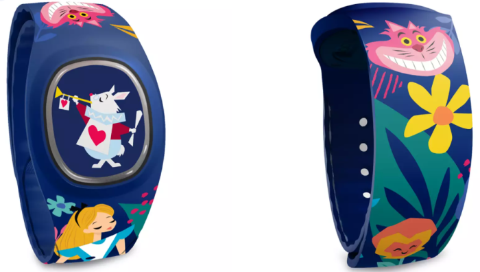 Go down the rabbit hole with Alice on this fun MagicBand+ that features the White Rabbit on the tappable icon. You’ll find Alice, Cheshire Cat, and the singing flowers on the strap.