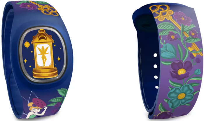Tinker Bell is the star (and rightfully so) of this MagicBand+ design that features her trapped in Captain Hook’s lantern on the tappable icon. The band has Tink with a button, a key, and some pretty flowers.