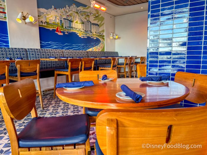 It’s beautifully designed, with Mediterranean-style blue-and-white décor, murals, and tile flooring that make you feel like you’re lounging in some chic European seaside café.