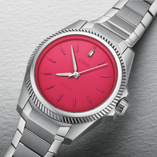 The watch has a hot pink dial, a baguette-cut lab-grown diamond at the 12 o’clock position, and a 34 mm stainless steel case.