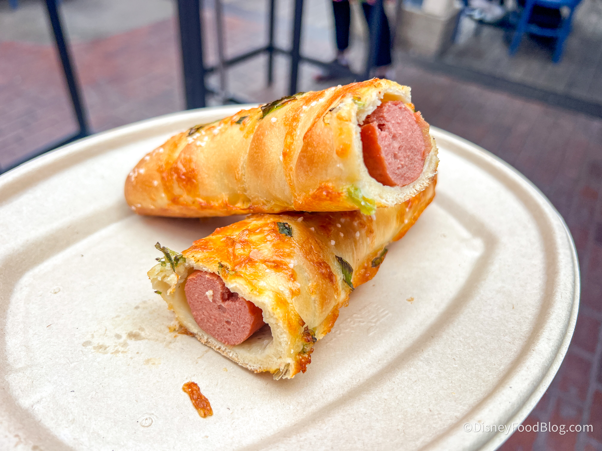 Over at San Fransokyo Cerveceria in San Fransokyo Square, we grabbed the Pretzel Wrapped Hot Dog for $10.99. This is a pretzel-wrapped 12-inch hot dog with scallions and mustard, and as you can imagine, we were a little scared.