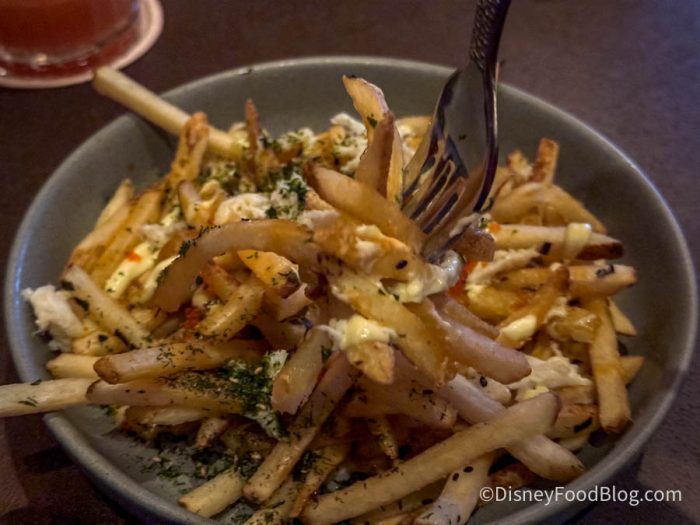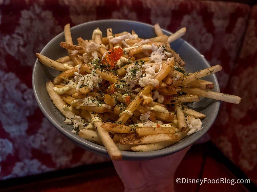 The fries themselves were your standard Disney thin-cut fries, and while they’re perfectly fine on their own, they didn’t hold up well under the toppings. The wasabi aioli wasn’t as bold as we expected, and the doenjang added a touch of umami but lacked the punch we were hoping for. The tobiko added a fun texture with its little bursts of saltiness, but the crab meat was a letdown.