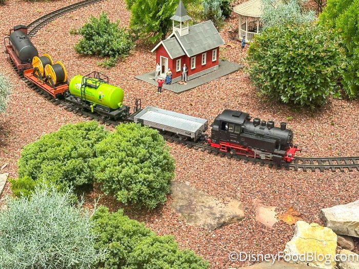 The anarchy within is mostly created by natural occurrences, like giant squirrels, wind, rain, and relatively godzilla-sized lizards who frequent the town; but we find it fun and entertaining to make up fictional stories about what COULD be happening. We are grateful to the folks who create and maintain this Tiny Train Town for Disney World, as it’s one of our favorite parts of EPCOT and always has been.