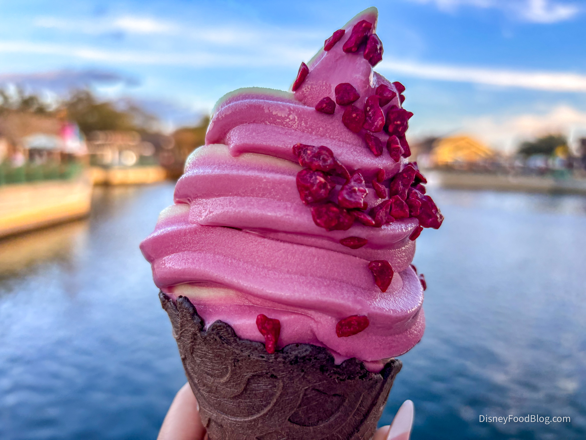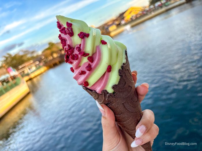 We recently grabbed the new Dark Chocolate Cone. This $6.49 treat is made up of DOLE Whip Raspberry swirled with DOLE Whip Lime, covered in raspberry crispies, all inside a dark chocolate waffle cone. So what did we think? Well, that’s…a little complicated.