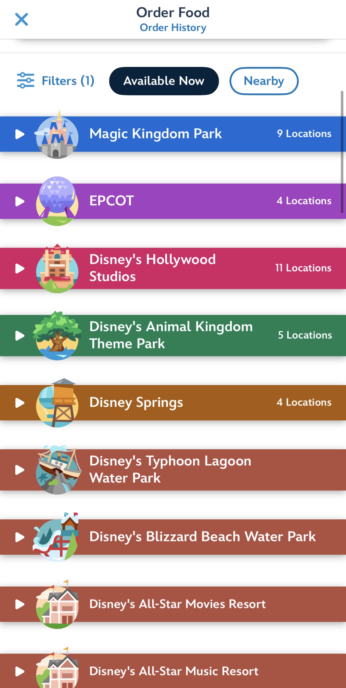 You can filter by location and resorts, but our two favorite filters are “Nearby” and “Available now.” These filters are super helpful to help you see what you can order right now and what is near you. While some Mobile Order times may not be too far out, being able to filter and see what you can pick up right away can make it easier to choose where you want to eat.