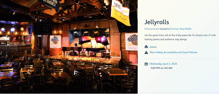According to the Disney World website, Jellyrolls still shows operating hours through April 2025, though the dates and hours are subject to change. The bar opens at 7 PM and remains open until 1:45 AM most nights.