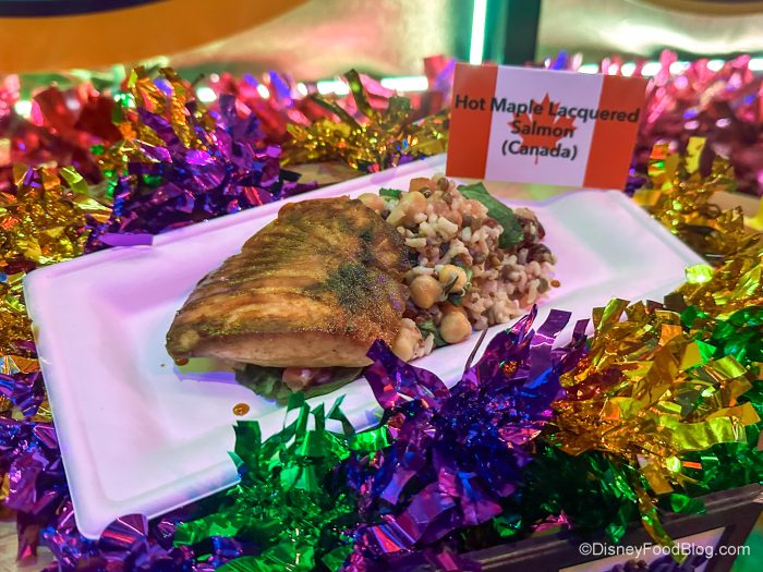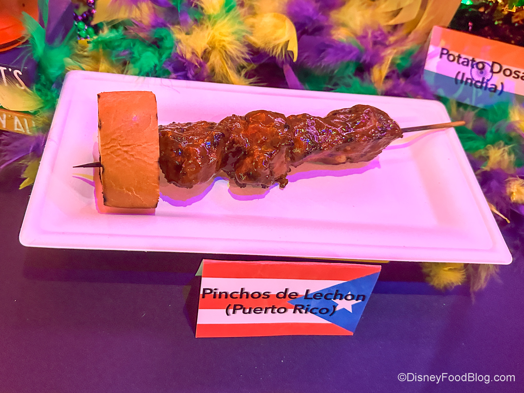 There are so many different food and drinks to try at this festival, thanks to the 13 different booths! This year also includes a new booth: India. Universal says they tried to make the food booths as authentic as possible. This year, they’re particularly proud of the vegan red beans and rice, Cajun baked Mac & cheese, and the China booth. We got to sample a few things, like the Pinchos de Lechon From Puerto Rico…