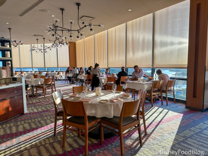 …and over to your area of the dining room. From there, you’ll find your seat at either a table or booth that will be flanked on one side by cascading windows giving you a stunning view of Magic Kingdom in the near distance.
