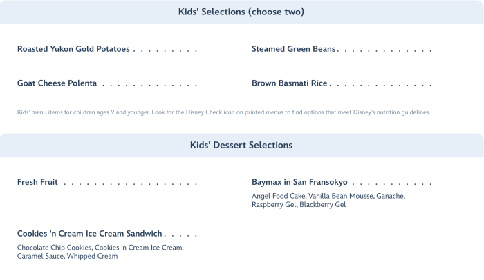 …a few choices of sides, and finally fresh fruit, Baymax in San Fransokyo, and Cookies ‘n Cream Ice Cream Sandwich for dessert.