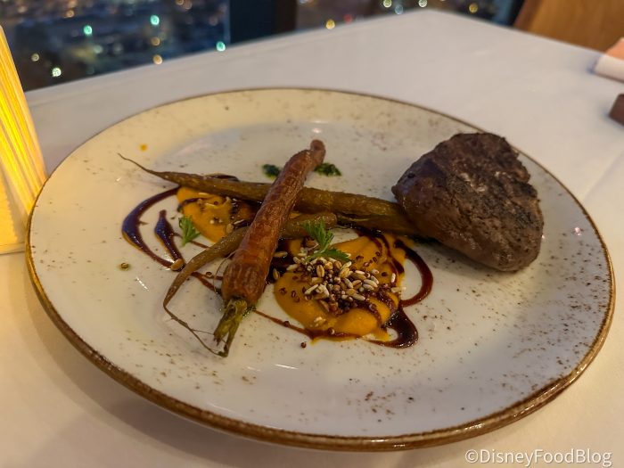 We opted to have our filet cooked to a medium temperature which means it was presented to us with a pink center to the beef — but don’t let that color fool you! This meat was so tender and definitely makes the shortlist of best filets among Disney World’s restaurants.