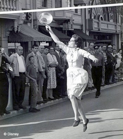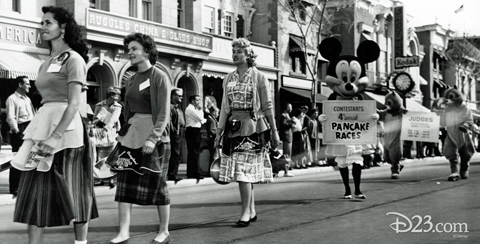 In August 1955, Quaker Oats opened a restaurant in Disneyland, Aunt Jemima’s Old South Kitchen, in Frontierland. So Disney partnered with Quaker Oats to hold the first Disneyland Pancake Race in 1957. Women from all over the country had to compete in several cities to qualify.