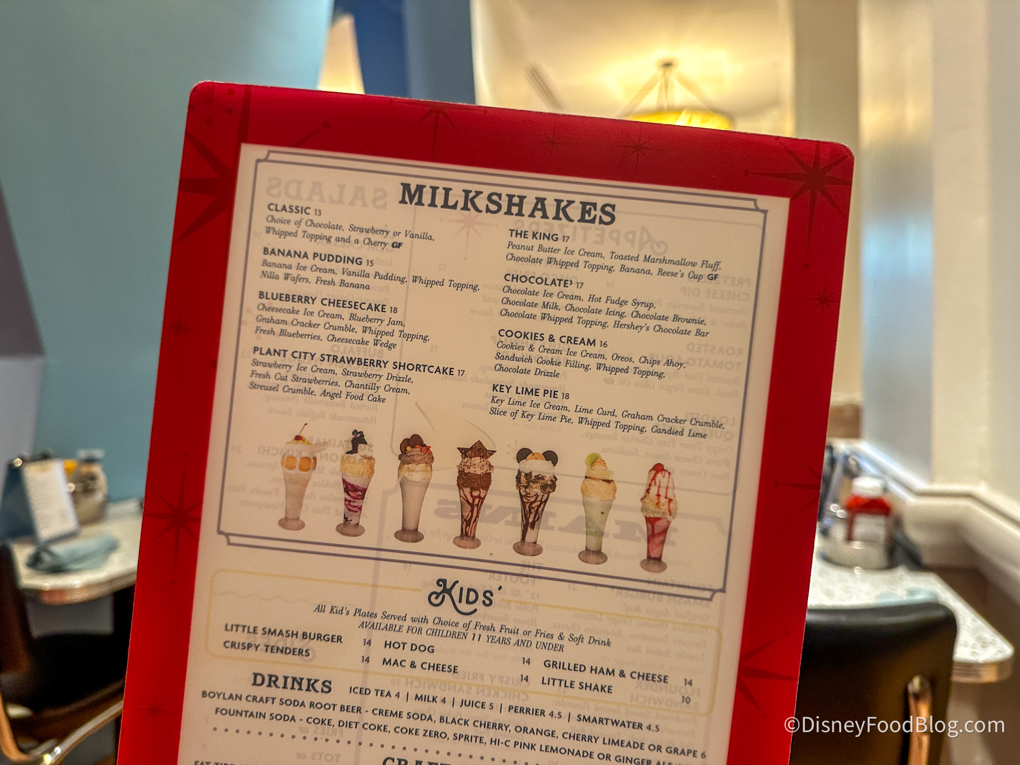 And, of course, we can’t forget about the milkshakes! There are eight different flavors of milkshake here, and they all sounded absolutely amazing to us. Underneath them, you’ll find the kids’ menu and regular drinks listed as well.