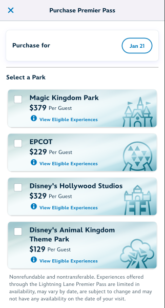 Guests must have valid theme park admission prior to purchasing. Additionally, you’ll want to have your whole party loaded into and linked together on the My Disney Experience App prior to purchasing. To purchase the Premier Pass, open your app and you’ll see “Lightning Lane Premier Pass” on the home screen. Next, tap “Purchase”. Follow the prompts to complete your purchase, and you will receive a confirmation when your purchase is complete.
