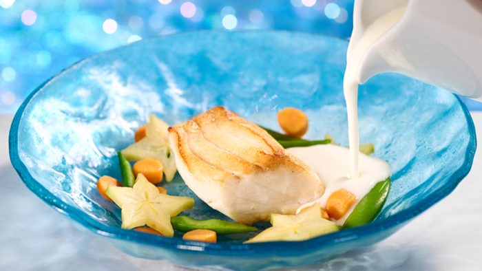 - Sea Bass (Atlantic) – a delectable portion of Sea Bass nestled amid the subtle sweetness of carrot mochi and vibrant crunch of fresh sugar snap peas. Aromatic lemongrass broth complements the buttery bass, while starfruit slices add a splash of tropical citrus notes