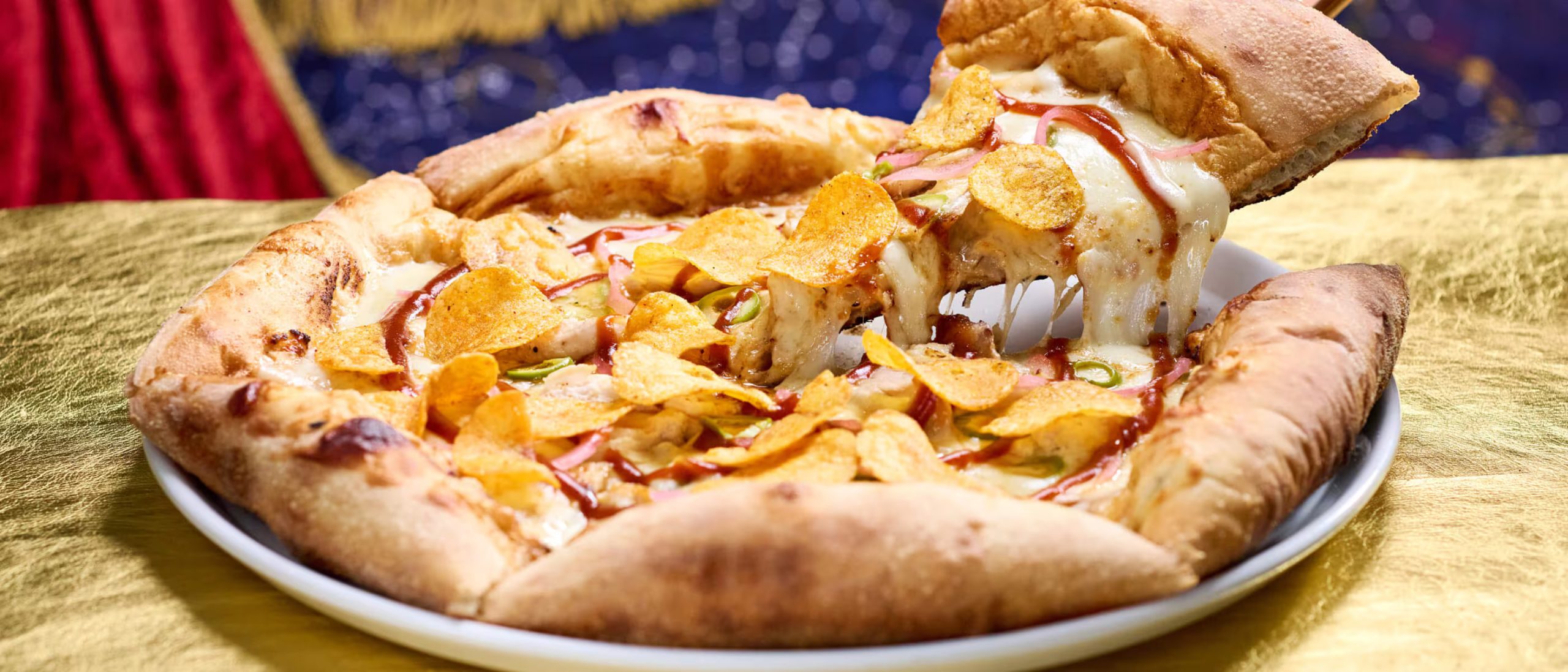 - Space Cowboy (Pizza Moon) – Saddle up for our space adventure, featuring tangy BBQ sauce tender rotisserie chicken, pickled red onions, Castelvetrano olives and crunchy BBQ potato chips.