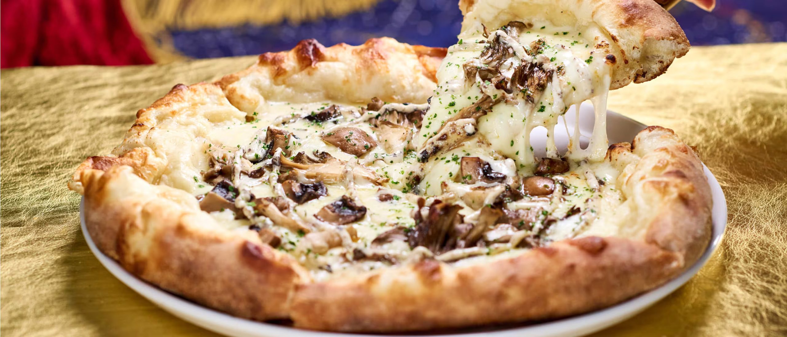 - The Giant Mushroom (Pizza Moon) – Experience the earthy flavors of this pie. Topped with creamy roasted garlic bechamel, fromage de lune, savory wild mushrooms and drizzled with truffle aioli, this pie is a culinary adventure.