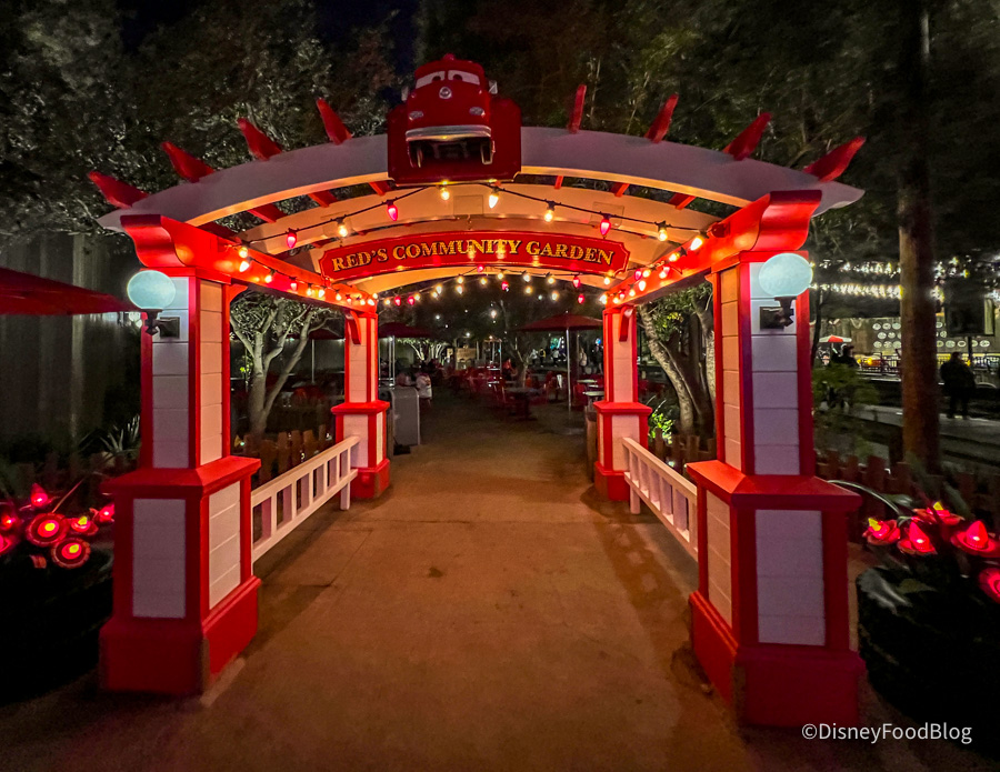 Red’s Community Garden seating area is now open at Disney California Adventure! You’ll find this spot located just to the right of the Cozy Cone Motel. Red is the anxious firetruck from the Cars films who is known for his love of plants (hence the garden) and people (hence the seating).