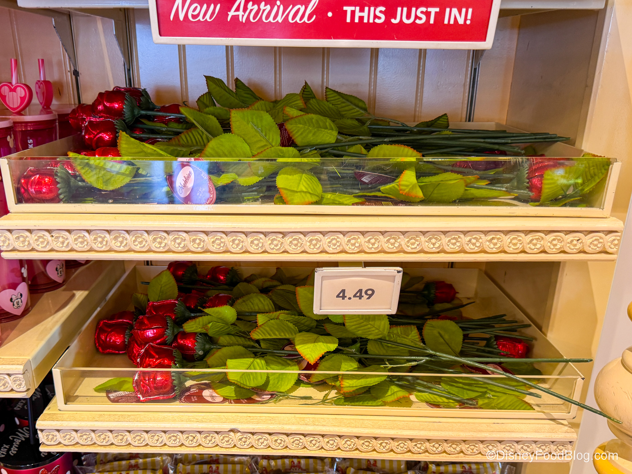 For $4.49, you receive one flower, which comes with the chocolate rose and the decorative stem and leaves. For the price, we wish it was solid chocolate instead of a hollow treat, but leaving it hollow makes it easier to eat and a perfect quick snack after a long Disneyland day.