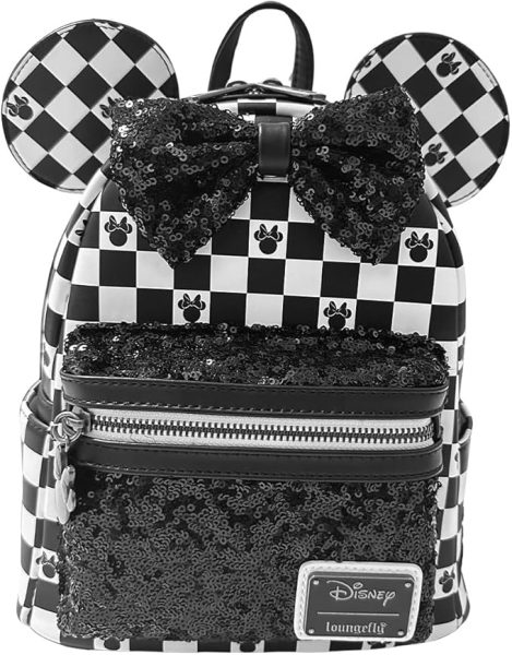 The Loungefly Minnie Mouse Checkered Sequin Backpack stands out with its sequined bow, chic pattern, and attached silver Minnie-shaped zipper pull.