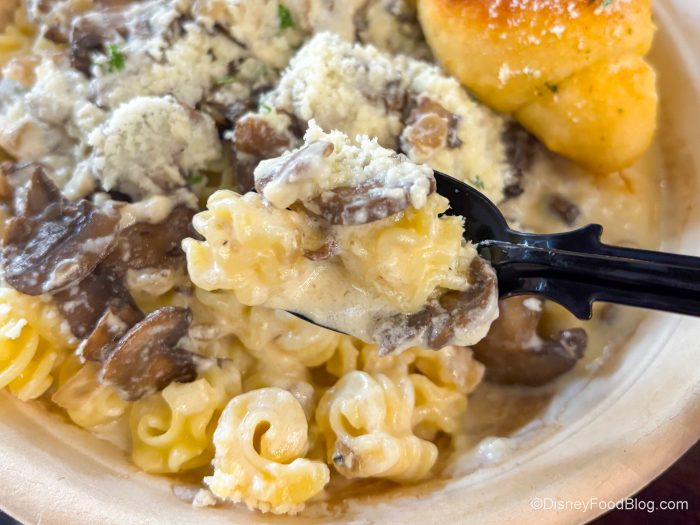 We also had to try out some of that Pasta. Now, like we said, the pasta selection changes daily. We went with the Forager Pasta for $16, made with Cavatappi pasta tossed with four cheese sauce, freshly roasted mushrooms, and onions. Garnished with fresh parsley and grated parmesan cheese and served with a freshly baked garlic knot. Heads up — this was our favorite thing that we tried. We’ll say that this pasta is on par with what you’d find at table service Italian restaurants in Disney World.