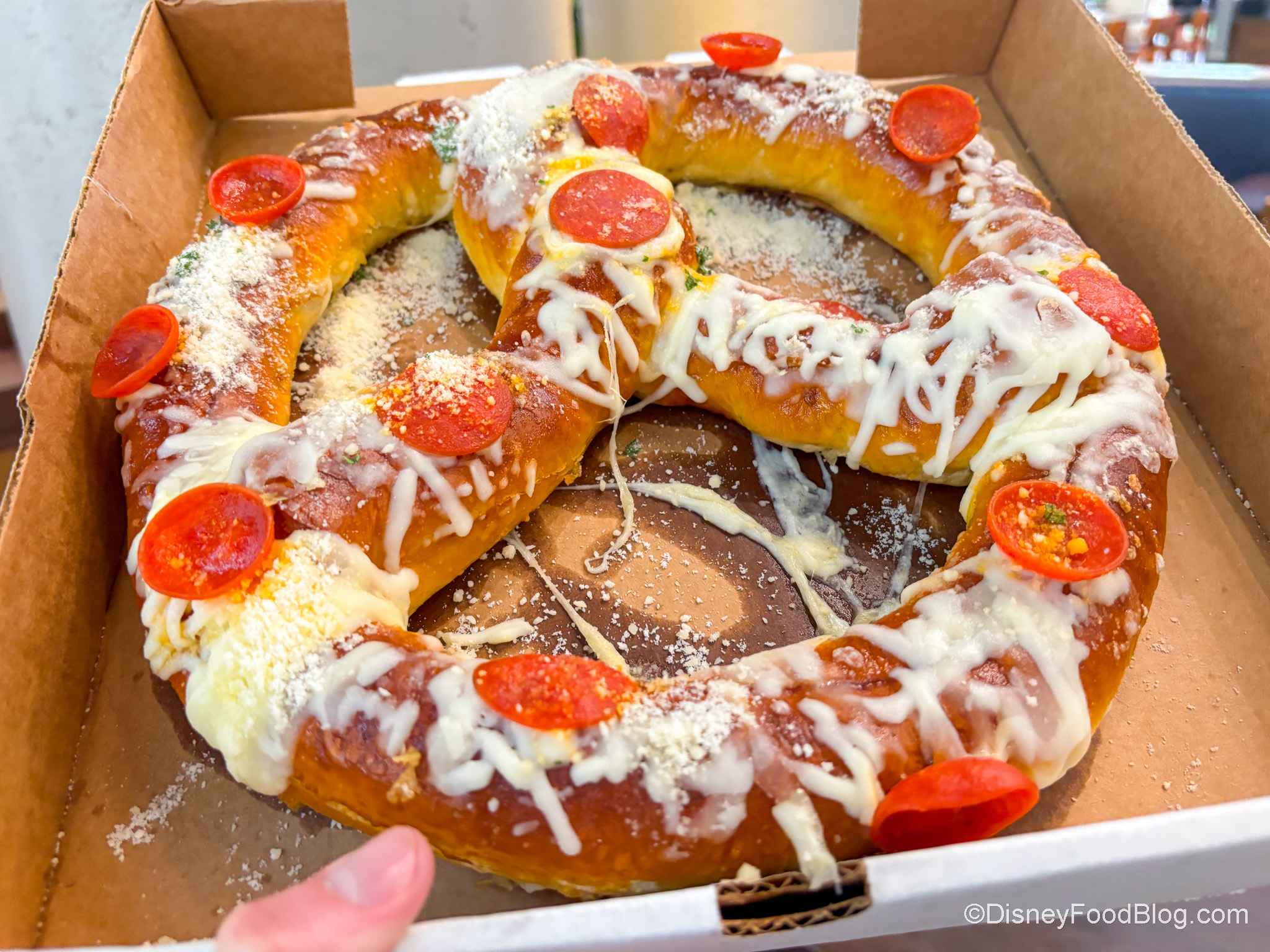 The cheese topping on top is also good, although you know us…we want MORE cheese. The pepperoni has a nice light spice to it and adds a lot of great flavor. The marinara sauce is a herby and tomato sauce and goes really well with the pretzel. Is it unique? Well, maybe not. But is it big? YES. This could easily be shared.