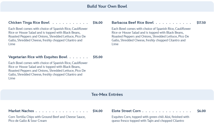 You can also get a customizable bowl, as well as some Tex-Mex entrees.