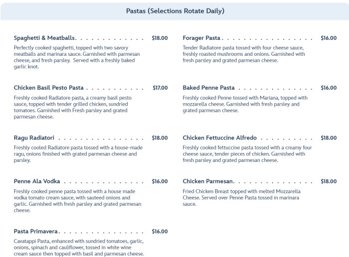 There are also a HUGE variety of pastas to choose from, but note that these pastas rotate out daily, so some of these might not be available when you visit.