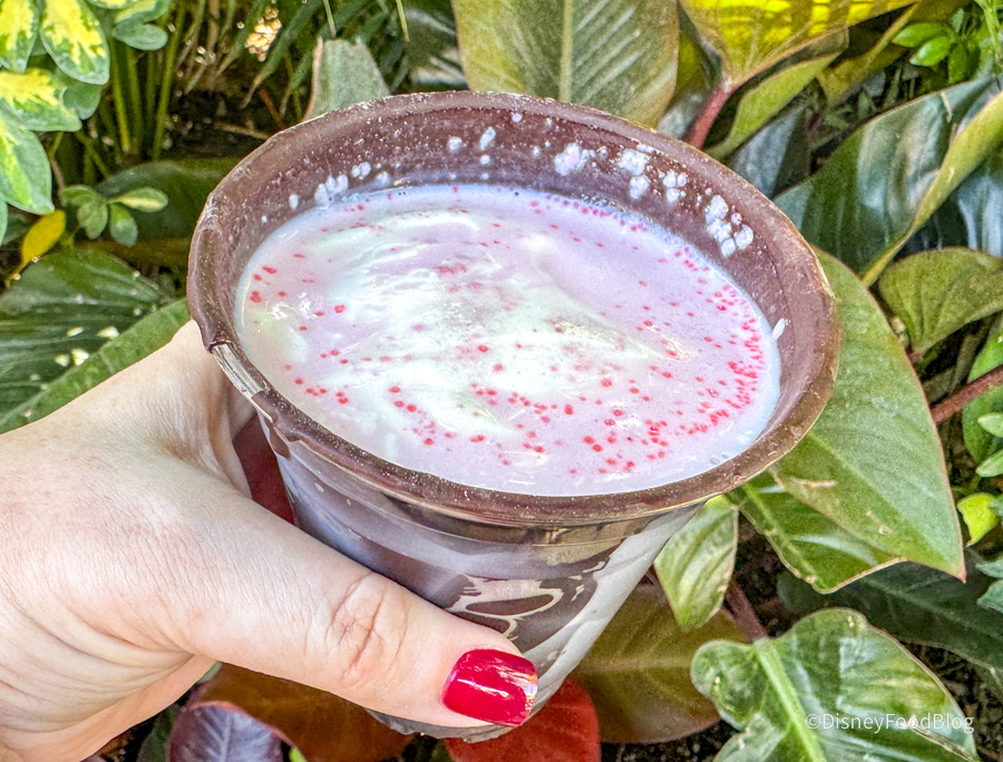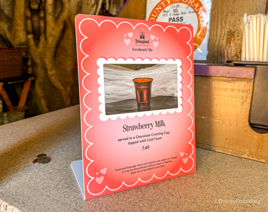 Over at Bengal Barbecue in Disneyland Park, you can currently get your hands on the Strawberry Milk served in a chocolate cracking cup topped with cold foam. This treat was originally around for Sweethearts’ Nite and Valentine’s Day, but you can get it during the day now, too. What is a “chocolate cracking cup” you ask? Essentially, the cup has been coated on the inside with melted chocolate that then hardens, and you “crack” the chocolate by squeezing it. Still confused?