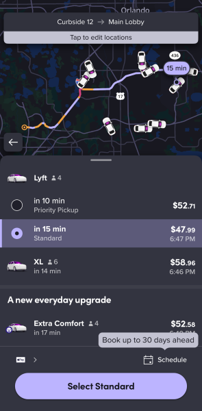 - Uber Comfort/Lyft Extra Comfort – A slightly more luxurious and spacious ride