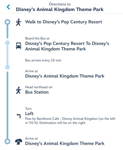 It’s not just for walking paths, either! If you’re park-hopping or need to take Disney transportation, the “Get Directions” feature can tell you exactly how to get where you need to go, including which transportation option to take. Trying to get from your hotel at Pop Century to Disney’s Animal Kingdom? The app will tell you where the bus stop is and approximately how long it will take to get there.