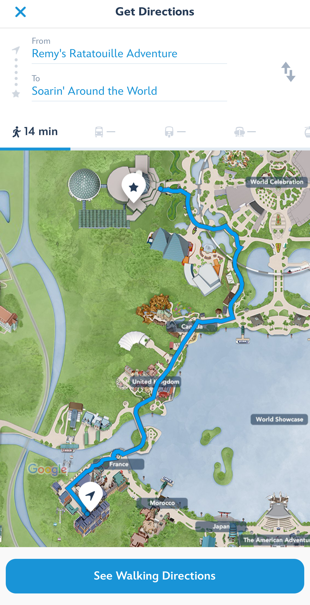 From there, the app will show you the best route, whether you’re walking, hopping on the Disney Skyliner, taking a bus, or even catching a boat.
