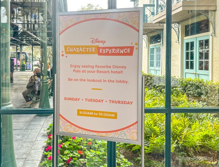 In this case, at Port Orleans — French Quarter, you can expect to see a Disney character or two on Sundays, Tuesdays, and Thursdays from 9:30AM to 10:20AM in the lobby. It’s not a huge window of time, but you might be able to catch them on your way to or from breakfast, or maybe even as you’re heading into the park if you’re not rope-dropping! No characters were listed on the sign, as the appearances will likely vary.