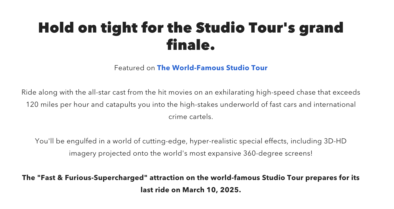 A new hotel for the park was just approved, but it’s just been confirmed that part of a popular attraction will be closing for good in less than one month. If you love the Studio Tour attraction at this park, the Fast & Furious-Supercharged section will be open for the last time in March 2025.