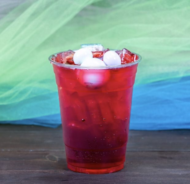 You can also grab the After School Fruit Punch at the Little Red Wagon. The punch is apple juice with pineapple and cherry flavors served with a themed glow cube. This is a fun, non-alcoholic option available at the event.