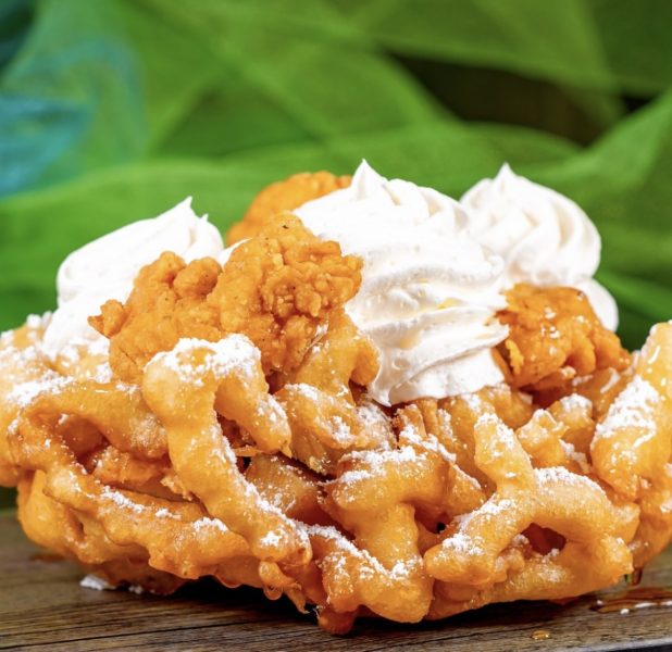 For a sweet and savory combo, you might want to try the Chicken and Funnel Cake at Stage Door Café. It is a funnel cake topped with chicken tenders, whipped syrup with powdered sugar, and whipped cream.