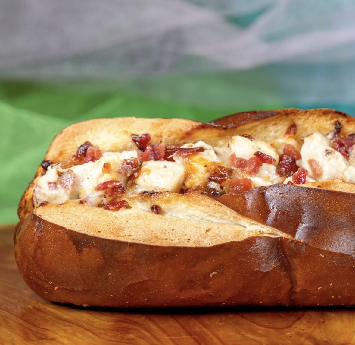 If you are looking for something savory, you can grab the Chicken-Bacon Cheesy Garlic Pretzel Bread at Edelweiss Snacks and Maurice’s Treats. This snack is a chicken and bacon-stuffed cheesy pretzel bread.