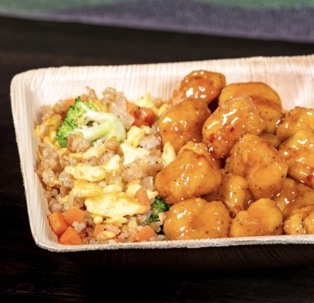 There is an Orange-glazed Chicken Bowl available at Bengal Barbecue. The bowl features garlic fried rice, scallions, and orange sauce.