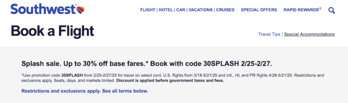 - Discount is only valid on Southwest.com, swabiz.com, and Southwest Partner Services. The discount is not valid on group travel or Southwest Vacations®, through Global Distribution Systems, or special fares, such as military and government fares.