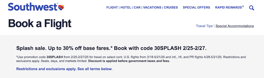 From February 25th through the 27th, the budget airline is running a Splash sale, during which anyone who books using the promotional code can save up to 30% on base airfare for select U.S. flights between March 18th and May 21st.