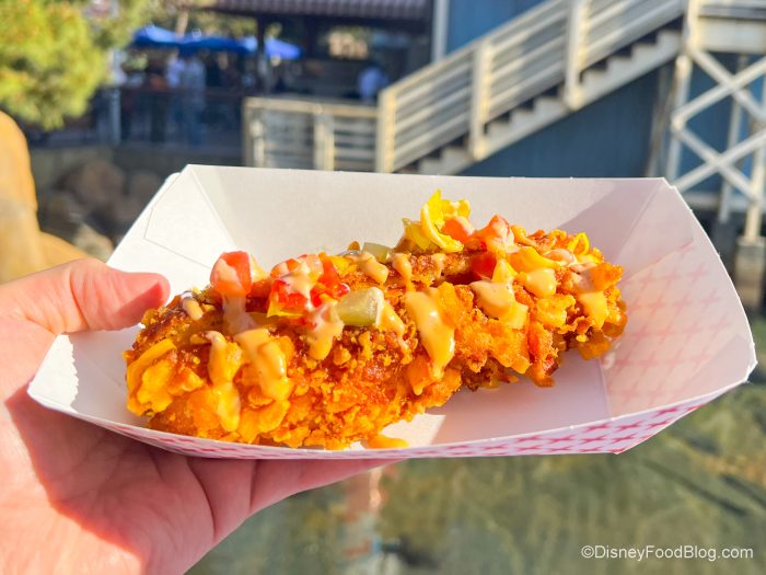 Finally, we headed over to Corn Dog Castle to try the new SoCal Corn Dog rolled in fries and topped with tomato and pickle relish, American cheese, and house dressing for $10.79 without sides and $13.59 with sides. There is a LOT going on with this, but you know what? We love it! The breading is thick and it had a great crunch. The cheese was beautifully melted and blended well with the other flavors.