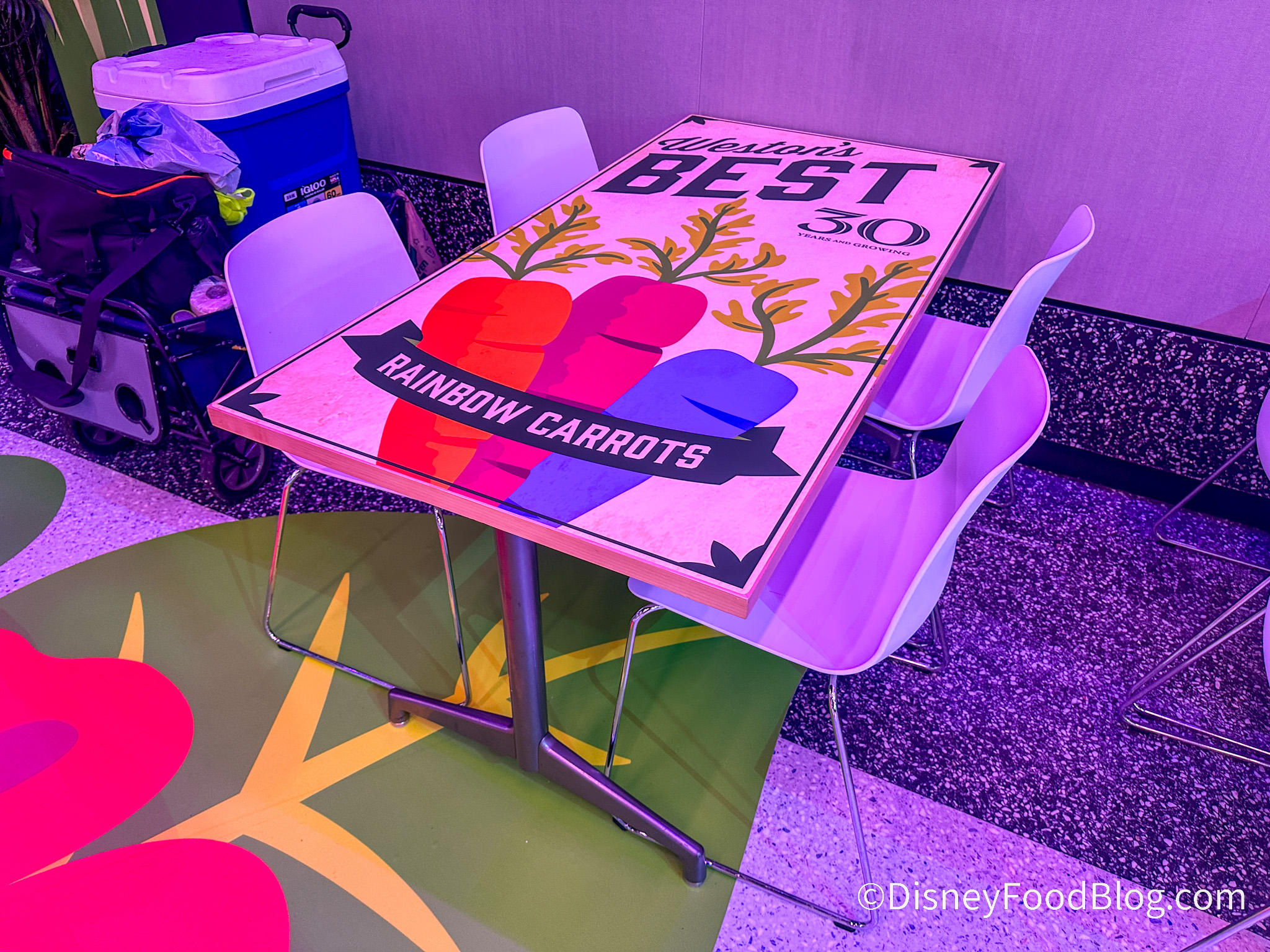 As well, don’t miss a quick glance at the tables! They are covered in fun designs that feature different veggies including bell peppers, radishes, and carrots.