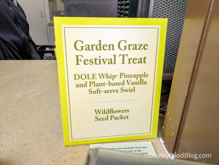 Once you have five stamps, you get the finisher treat, which is a DOLE Whip Pineapple and Plant-based Vanilla Soft-Serve Swirl and a Wildflower Seed Packet. We always love a classic Pineapple DOLE Whip, and we love that it had plant-based vanilla to tie into the Garden Graze, which was entirely vegan! In a traditional DOLE Whip, the vanilla is not plant-based, but we didn’t think that affected any flavor, just that it melted a little faster. It reminded us of a pineapple creamsicle!