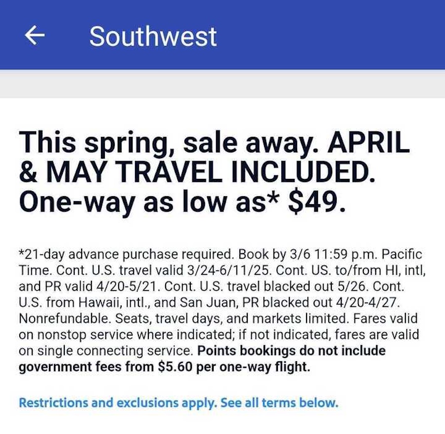 Southwest Airlines is currently offering a Spring Travel Deal featuring one-way fares this April and May for as low as $49. However, you’ll need to act fast as the deal expires at 11:59 PM PST on March 6th.